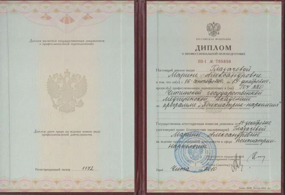 • 2010 — Читинская государственная медицинская академия (Врач по специальности "Психиатрия-наркология").