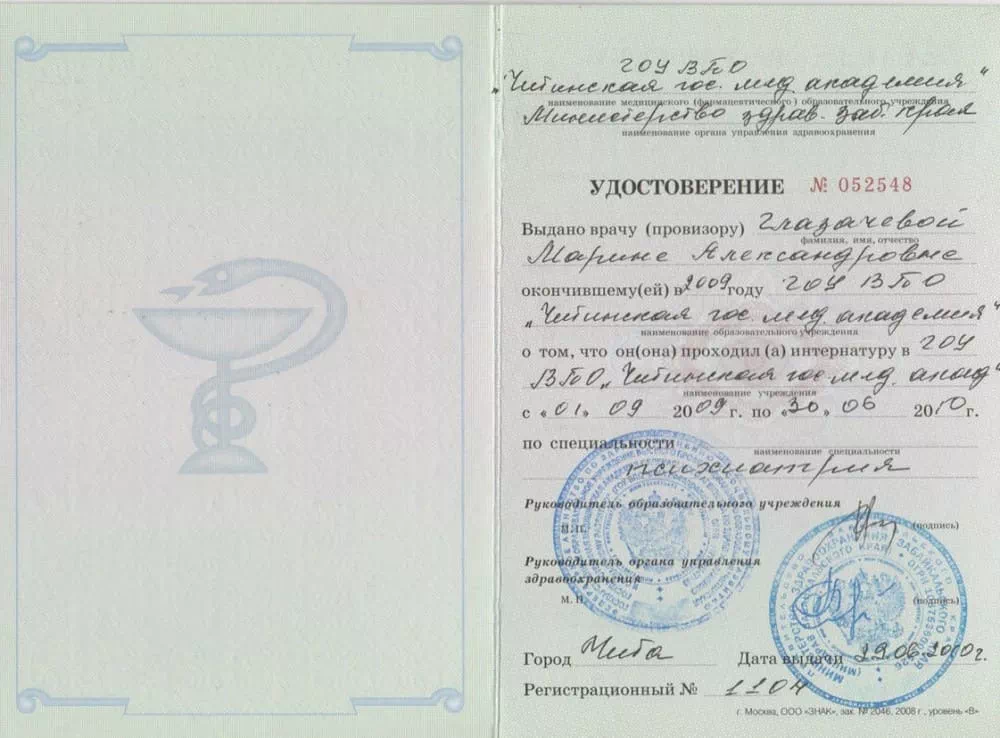 • 2010 — Читинская государственная медицинская академия (Интернатура по специальности "Психиатрия");